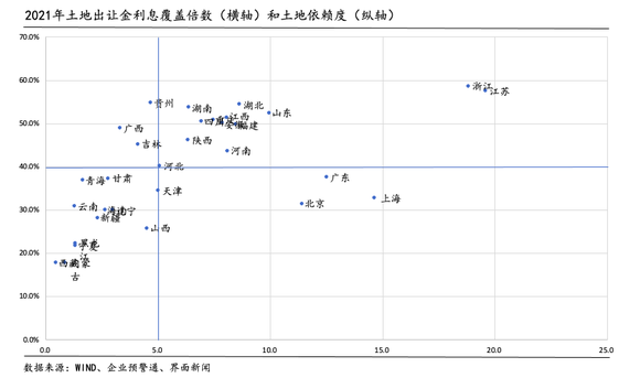 分析师通常使用土地出让金利息覆盖倍数,即土地出让金与地方债付息额之比,来衡量地方政府卖地收入对债务利息的覆盖能力。倍数越大,债务付息压力越小,反之亦然。