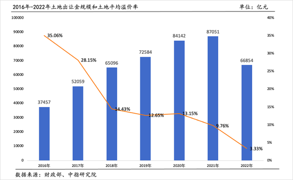 土地平均溢价率走低较土地出让金下滑更早显现。中指研究院数据显示,2016年和2017年土地平均溢价率高达30%左右,而伴随着调控政策收紧,溢价率逐渐走低,2022年已下降到3.3%左右。