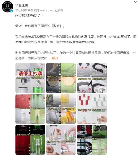 近段时间,就有本土美妆品牌毕生之研与联合利华旗下功效护肤品牌Murad慕拉得广告创意高度“撞脸”,引发了网友的热议。2月1日晚间,毕生之研通过微博、小红书等社交平台发声回应此事,称其产品创意视频是被Murad慕拉得“1:1复刻”。