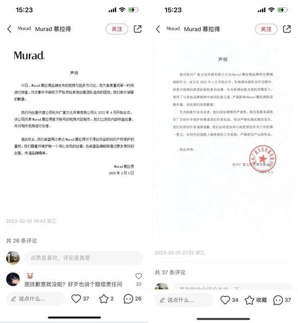 随后,广意公司也通过Murad小红书账号发布声明,承认了公司视频创意团队“因版权意识淡薄,在未取得创意方授权的情况下使用了与其他品牌视频中相同创意元素”,并为严重影响Murad品牌形象而深表歉意,同时向原创作者道歉。