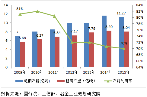 (2)2013年钢铁被国务院列为产能严重过剩行业。截至2015年底国内粗钢产能11.27亿吨,根据国务院《关于钢铁行业化解过剩产能实现脱困发展的意见》,将用5年时间压减粗钢产能1亿—1.5亿吨(50万钢铁企业员工面临失业)。