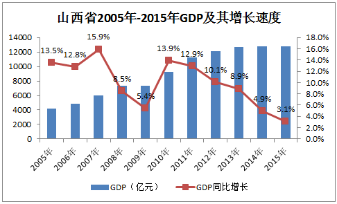 (3)2015年山西省GDP增长速度仅为3.1%,远低于全国GDP增长速度6.9%。