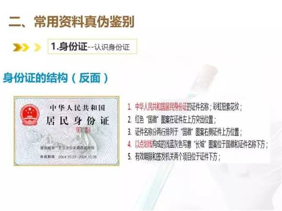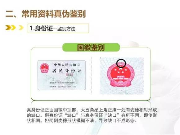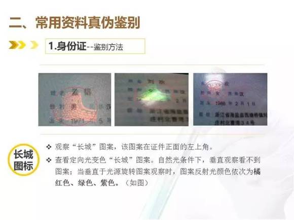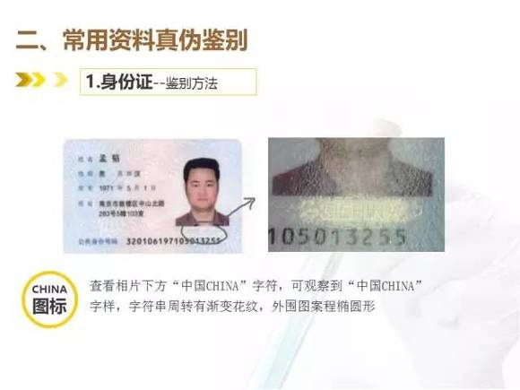 u 手感:真身份证手摸有前凸后平的感觉,四周压封平实,清透;假身份证手摸多有前后双凸的感觉,四周压封处多有胶熔性气泡反映