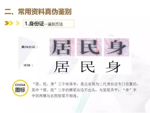 “居、民、身”三个宋体字,是公安局为二代身份证专门设置的,其中“居、民”二字的横笔右边不出头,与数笔齐平;“身”字中间两横与右侧竖笔不相连。