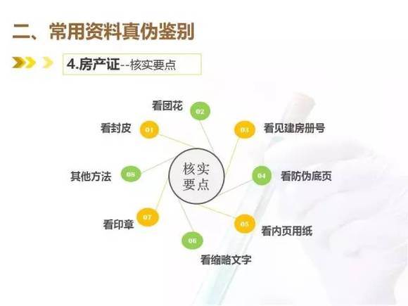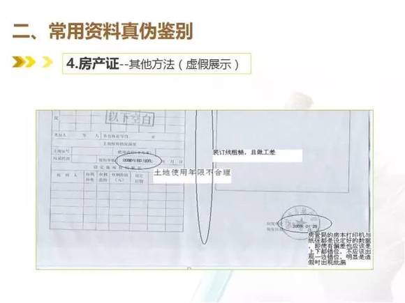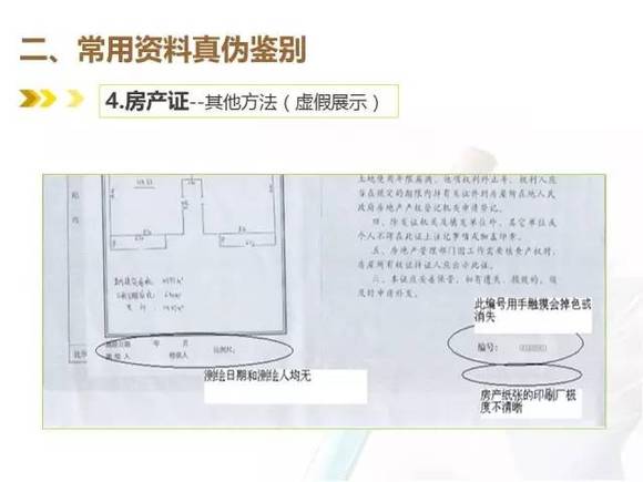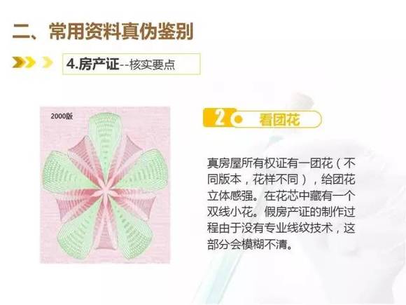 真房屋所有权证有一团花(不同版本,花样不同),真团花立体感强,在花芯中藏有一个双线小花;假房产证的制作过程由于没有专业线纹技术,这部分会模糊不清。
