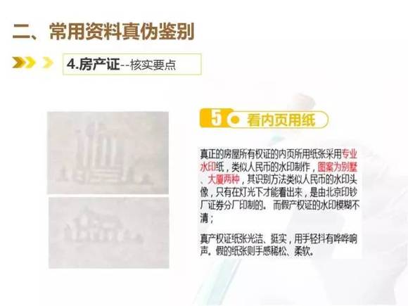 真房屋所有权证的内页所用纸张采用专业水印纸,类似人民币的水印制作,图案为别墅、大厦两种,其识别方法类似人民币的水印头像,只有在灯光下才能看出来,是由北京印钞厂证券分厂印制的;而假房屋所有权证的水印模糊不清。