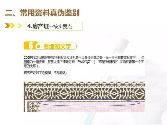 2000年以后印制的房屋所有权证发证机关一页最定行花边最下面一行里藏着微缩文字,用肉眼看为一道虚线,在放大镜下清晰可辨“FWSYQZ”(“房屋所有权证”汉语拼音第一个字母的大写);假房屋所有权证字迹模糊,不易辨认。