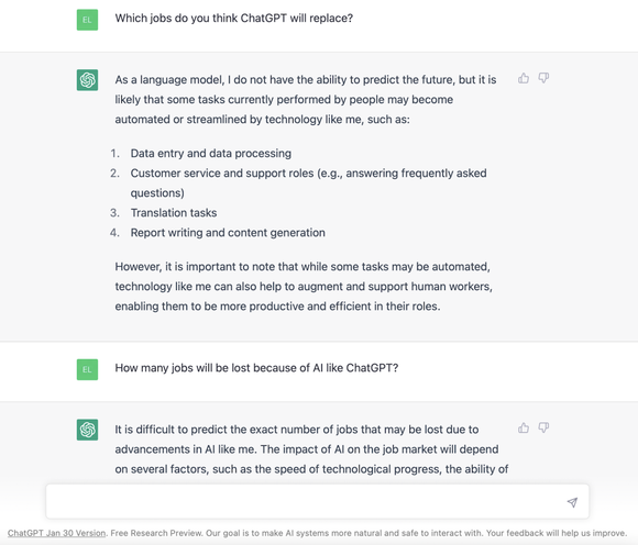 在被问及“你认为ChatGPT会取代哪些工作”时,它委婉地回答道,“我无法预测未来”,但“一些目前由人执行的任务,可能会因为像我这样的技术实现自动化或得到精简。”