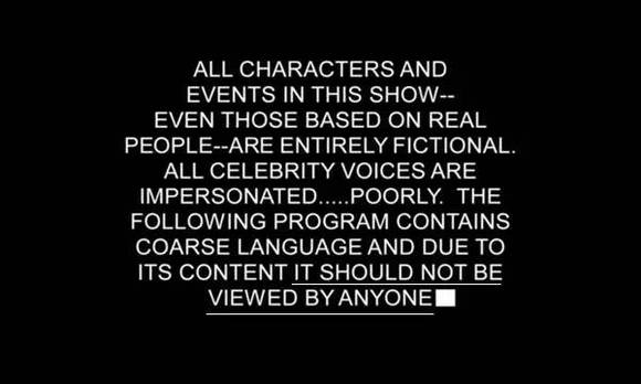 “本动画中所有角色和事件——包括以真实人物为原型的角色——均为虚构。所有的名人配音都是很烂的拟音。此节目语言粗鄙,内容混蛋,任何人都不宜观看。”
