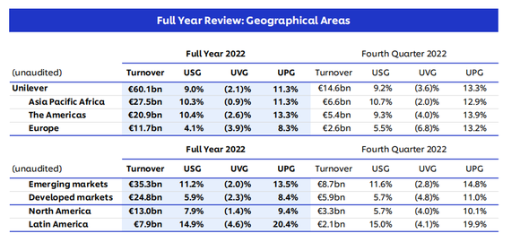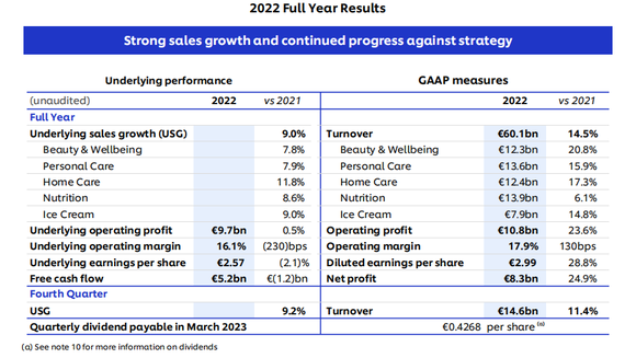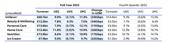 在财报中,联合利华提到,2022年集团谨慎地平衡了价格增长、数量和竞争力,以应对高成本通胀环境,集团将在2023年再次实现强劲的销售额增长,并提升集团整体竞争力。