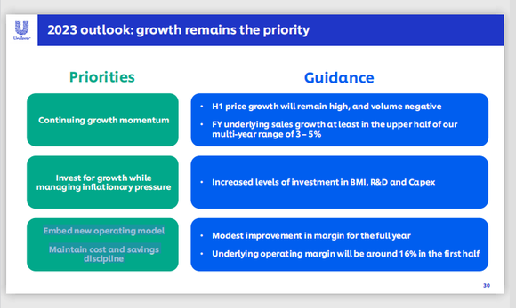 联合利华提到,“上半年,基本价格增长将保持高位,成交量增长将为负值。随着价格增长趋缓,成交量将有所改善,但现在说下半年成交量是否会转正还为时过早。我们预计2023年的基本销售增长率至少在我们多年范围的3-5%的上半部分。”利润上,联合利华预计将有轻微增长。