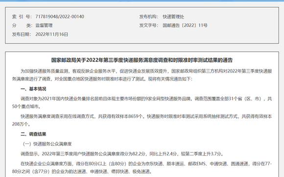 通告显示,2022年第三季度,在快递企业公众满意度维度,得分在80分以上(含80分)的企业为京东快递、顺丰速运、邮政EMS、中通快递、圆通速递,得分在77-80分之间(含77分)的企业为韵达速递、申通快递、德邦快递、极兔速递。