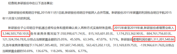 行政处罚决定书显示,因新研股份收购明日宇航,2015年11月1日起,新研股份将明日宇航纳入合并范围。新研股份2015年披露的利润包含明日宇航2015年11月至12月的利润,新研股份子公司明日宇航通过虚构业务和提前确认收入两种方式实施财务造假。2015年度至2019年度,新研股份虚增营业收入累计约33.47亿元,虚增利润总额累计约13.11亿元。