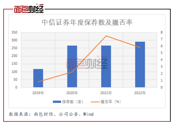 除了保荐数增长之外,中信证券的撤否率也在增加。Wind数据显示,2019年至2021年,中信证券的撤否率从0.85%增长至7.52%,增长了6.67个百分点。