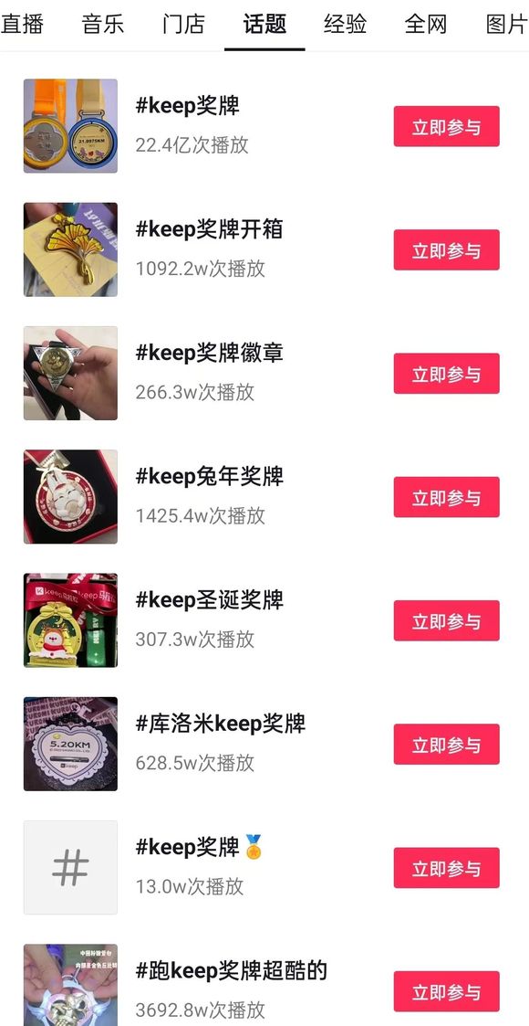 小红书之外,在抖音、B站、微博等社交平台上,也能搜索到大量“Keep奖牌”的相关内容。其中,抖音Keep奖牌相关短视频播放量已达22.4亿次;Keep奖牌开箱话题播放量也有超千万次。微博上,Keep奖牌相关话题阅读量达1.6亿,讨论量21万。