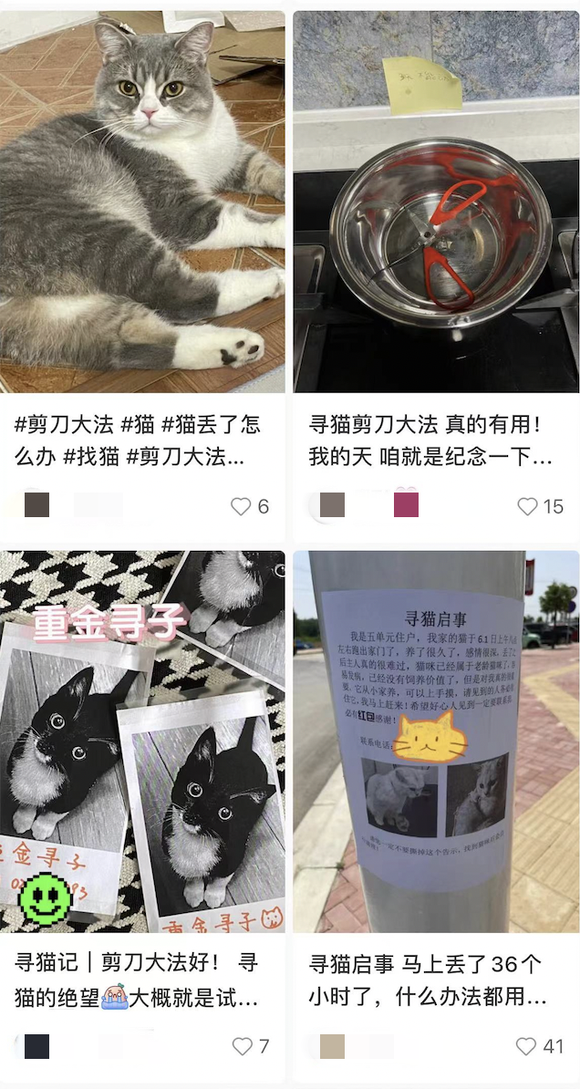 焦虑的失主们有时也会诉诸“运气”,比如打点流浪猫,转发锦鲤,以及找猫界最负盛名的“剪刀大法”。科技博主“魔术师R”在2021年2月丢了一只猫,丢了两天半之后,是张展飞花了2小时找到了。他的找猫过程在微博被转发了3.7万次,15万人点赞,顶上当日热搜。