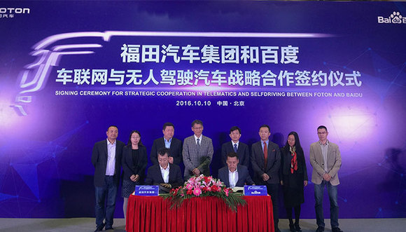 10月10日,福田汽车集团在北京与百度签署战略合作协议,将就车联网、大数据、智能汽车和无人驾驶展开全面合作,共同打造面向未来的智能互联网商用汽车。