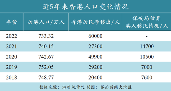 近五年来,香港居民净移出数量翻倍增加,2018年为2.04万人,2022年已达到6万人。