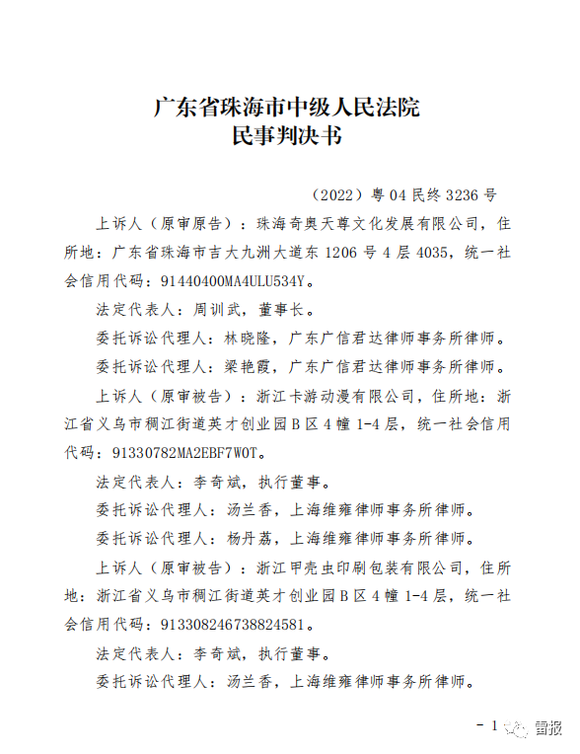 据披露信息显示,该起案件的原审原告为珠海奇奥天尊文化发展有限公司,原审被告为浙江卡游动漫有限公司和浙江甲壳虫印刷包装有限公司。