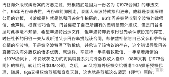 简单来说,《1976年合同》的核心就是圆谷将《奥特曼·赛文》《奥特曼·泰罗》《奥特曼·艾斯》等多部作品的相关权利授权给了采耀总裁辛波特,至此这些作品在日本以外所有区域的权利都归其所有。其中自然也包含中国,而且是永久的、独一份的。