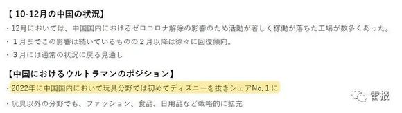此外,前文提到2022年7月圆谷于上海海洋公园(年均500万人到场)内开设的奥特曼主题专区,获得了超出预期的反响,进一步加速了奥特曼品牌在中国市场的渗透。据财报显示,2022年奥特曼系列商品在中国国内玩具领域第一次超过迪士尼,占据市场份额第一,也证明了近年来其深耕中国市场的战略性成功。
