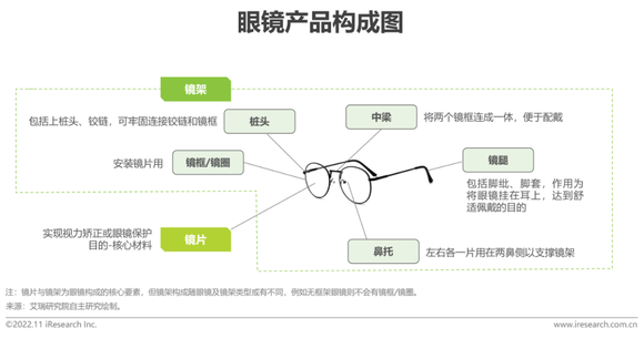 眼镜是用来矫正视力、眼睛保护或作装饰用途的光学器件,主要由镜片和镜架构成。镜片是眼镜功能属性的核心载体,用以实现视力矫正与眼睛保护功能。镜架通常由镜框/镜圈、桩头、中梁、镜腿与鼻托等部分组成,其核心功能与镜片配套构成眼镜,佩戴在面部起支架作用。另外在流行时尚趋势下,镜架带来的美观性、时尚度与脸型修饰功能也更加被人们所重视。本篇报告的研究对象即为眼镜,从眼镜、镜片、镜架三大维度展开,探究中国后疫情时代下眼镜行业的发展环境、产业格局、消费者需求变化等,为产业从业者及终端消费者提供信息参考。