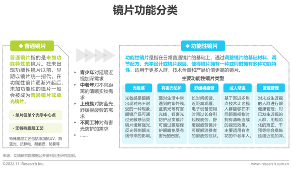 单光镜片可满足消费者基础的视光矫正及眼睛保护的基础需求,而受消费者终端需求驱动与镜片厂商追求收入增长的双重推力作用,功能性镜片产品开始被挖掘,以期迎合新的功能性消费需求,功能性镜片逐渐成为当下眼镜市场的主力军。功能性镜片在日常普通镜片的基础上,通过调整镜片的基础材料、调节配方、光学设计或镜片膜层,使得镜片拥有一种或同时拥有多种功能特性,以适用于更多人群,其技术含量和产品价值相对更高。目前市场普及度较高、且未来仍有极大需求空间的功能性镜片类型主要包括光敏感、有害光防护、舒缓视疲劳、成人渐进镜片与近视管理镜片。