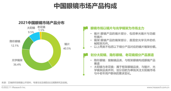 从产品维度来看,眼镜产品可分为框架眼镜与接触镜两大类,框架眼镜往下细分包括近视眼镜、远视眼镜、老花眼镜、散光眼镜、太阳镜等,接触镜核心指代隐形眼镜产品。从产品构成来看,镜片与光学镜架仍是眼镜市场的核心产品,占总体规模的比重分别为40.5%与36.4%;受益于线上渠道铺展,隐形眼镜触达客群更加广泛,零售规模占比提升至12.1%,太阳镜占比有所下滑,约占9.5%;老花镜占比仍较小,但得益于60后、70后对老花眼镜需求逐渐增加、该年龄层消费者对专业配镜认可度较高的利好因素,老花镜零售规模占比相比去年有小幅提升。