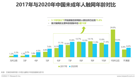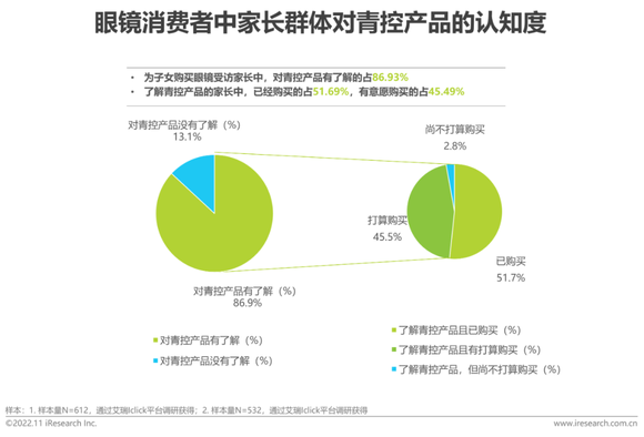 随着数智技术的发展和消费电子的不断渗透,中国未成年人首次触网年龄前置化明显,3-10岁及以下开始接触互联网的人数比例已达到75.8%,首次触网的主要年龄段集中在6至10岁;加之疫情时代下,学生线上课增加也进一步加重儿童青少年用眼压力,过度使用电子产品、课业压力大、户外运动少是影响儿童青少年眼健康的主要原因,在此背景下,家长群体对青控产品的认知度和购买意愿呈现双提升态势,艾瑞调研结果显示,为子女购买过眼镜的家长中对青控产品有了解的占86.93%,其中超过半数家长已经为子女购买了青控产品。