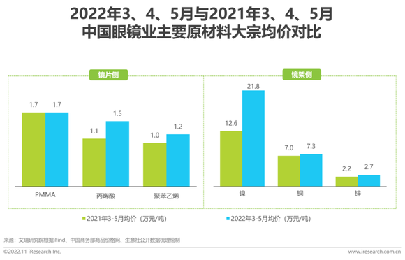 按照国家人社部、国家质检总局、国家统计局联合颁布的《职业分类大典》,中国眼视光技术人才主要有专业技术人员和社会生产服务和生活服务人员两类,从2018年与2021年中国眼镜行业各职级年薪对比情况看,近四年眼镜行业员工薪酬普遍增长,其中普通员工与基础操作员工薪酬涨幅超过20%。同时结合2021年3、4、5月与2021年3、4、5月中国眼镜行业主要原材料大宗商品均价对比情况,树脂镜片、镜架合金原材料价格显著上涨,对眼镜生产厂商侧具有一定生产经营成本压力,在零售端集中表现为眼镜价格上涨。