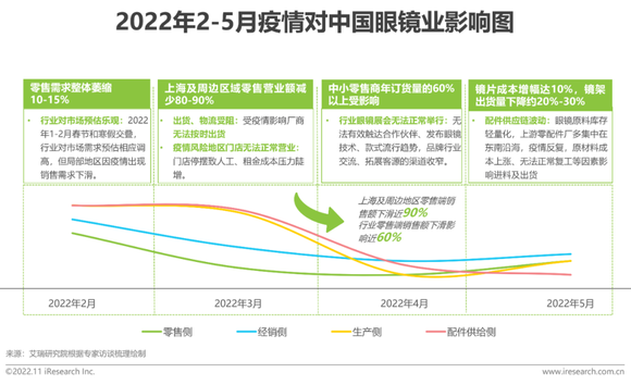 发展动态:2022年上半年以来,国际环境更趋复杂严峻,国内疫情多发散发,眼镜制造业出现了从产业链下游逐渐向上游传递的销售冲击,量化来看,2022年3-5月上海及周边区域零售营业额减少80-90%,中小零售商年订货量的60%以上受影响,国内眼镜产业生存压力加大。中国儿童青少年近视呈现高发、低龄化趋势,家长为子女购买眼镜时,最关注护眼抗疲劳与延缓近视发展,青控产品愈加受到市场青睐,各家头部镜片厂商集中发力,纷纷布局不同技术原理下的青控产品线,以蔡司、依视路、豪雅、万新为主要品牌,青控品牌认知逐渐形成。
