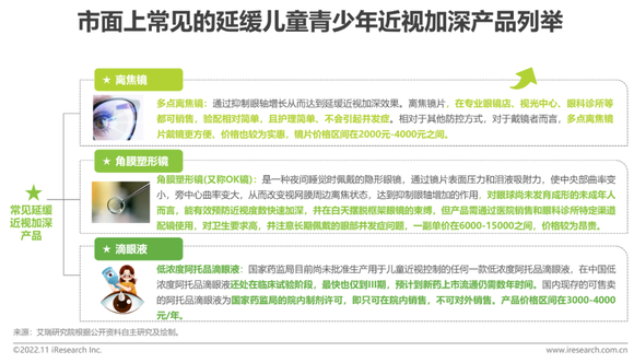 在政府、家长、学校对青少年儿童视力保护日益关注与重视的大环境下,延缓儿童青少年近视加深相关系列产品备受关注,主要包括离焦镜、角膜塑形镜与滴眼液。对比来看,角膜塑形镜可较快延缓近视度数增长程度且无需佩戴框架眼镜,但配镜渠道受限于医院与眼科诊所,对佩戴者的耐受度、眼部卫生保持情况、坚持佩戴效果等均有所要求;滴眼液产品仍处于临床试验阶段,仅以院内制剂形式做少量销售且应用效果反馈较少。而离焦镜由于其产品性价比、配镜渠道便捷性、近视延缓效果反馈的优势特点,快速获得市场关注,迎来了延缓儿童青少年近视加深需求推动下的爆发性增长。