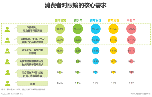 艾瑞调研结果显示,改善视力、视物清晰为消费者购买眼镜的首要产品需求。在电子化信息时代,人们用眼时间大大加长,长时间的观看手机、平板、电脑等设备,让消费者愈发倾向于眼镜具备防蓝光功能。而从细分群体来看,青少年对改善视力的核心需求更加集中,而青年女性对眼镜可以实现服装脸型搭配、衬托气质等美观需求的集中度明显高于其他客群。