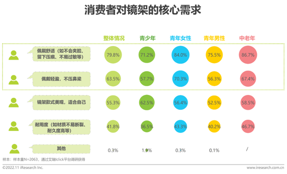艾瑞调研结果显示,镜架作为影响佩戴体验的核心元件,消费者对产品的核心需求在于佩戴的舒适感与轻盈感。同样随着镜架产品的流行性趋势与佩饰化倾向,消费者也会更加关注于镜架款式的美观度与适配度。相对而言,消费者对镜片耐用度的需求关注度则较为靠后。从细分群体来看,青年女性与中老年群体会更加注重镜架佩戴的舒适度与轻便度,而青少年在镜架款式美观、适合自己的需求上有更多考量。
