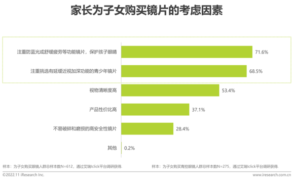 艾瑞调研结果显示,在2063份样本中,有612位家长在近一年内为子女购买过眼镜。家长为子女购买镜片时,首要考虑因素为镜片的防蓝光、舒缓疲劳、可延缓近视加深的功能性,甚至超过了视物清晰度高的需求。这表明镜片产品,尤其是青控产品,核心竞争力开始向增益性功能做衍生,为眼镜产品的差异化发展注入了新的活力。