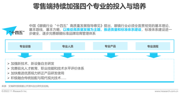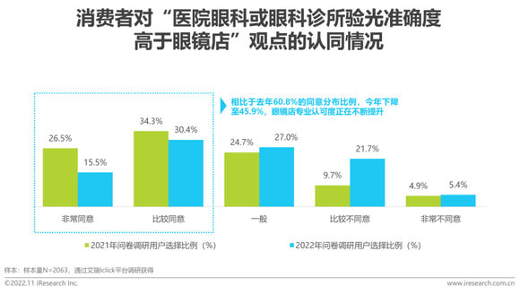 在中国《眼镜行业“十四五”高质量发展指导意见》中,重点提到了眼镜行业质量与标准体系建设的推进,零售端作为消费者配镜的主流渠道,需持续加强四个专业的投入培养,从设备、人员、产品、流程四个维度加强自主研发、人才培养、产品应用、验配视光融合的全套流程体系,以此获得在眼科医院、眼视光诊所的双重压迫和消费者购镜主观意愿发生变化环境下更多的生存空间。据艾瑞调研结果显示,零售端的投入培养正逐步得到正向回馈。相比于去年有60.8%的消费者认为“医院眼科或眼科诊所验光准确度高于眼镜店”,今年仅有45.9%,不到半数的消费者同意此说法,这说明消费者对于零售端眼镜店的专业认可度正在不断提升。