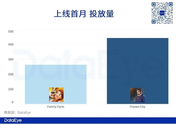 上线首月,两款游戏投放量中等,在200-500组区间。《Frozen City》约为《菲菲大冒险》的1.5倍。