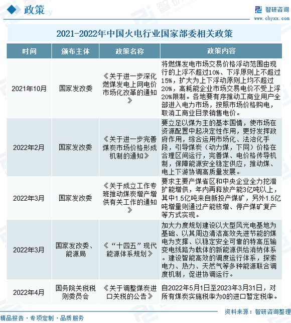 2022年3月由国家发改委颁发的《关于成立工作专班推动煤炭增产增供有关工作的通知》,要求主要产煤省区和中央企业全力挖潜扩能增供,年内再释放产能3亿吨以上,其中1.5亿吨来自新投产煤矿,另外1.5亿吨增量则通过产能核增、停产煤矿复产等方式实现。在全球气候变暖、国家生态环境恶化,全国加快发展新能源发电的形势下,为继续推动全国火电行业供给收益稳定发展、产业链上下游更加协调、火电行业市场管理规范优化,同时提高火力发电的竞争力,2021-2022年中国火电行业国家部委相关政策如下: