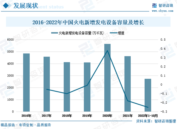 2016-2022年期间我国火电新增发电设备容量呈上下波动走势,其中2016-2019年我国火电新增发电设备容量逐年下滑,年新增容量由4836万千瓦减少至4092万千瓦,但在2020年我国火电新增发电设备容量出现大幅增长达到5637万千瓦,同比增长近38%。2022年1-10月我国火电新增发电设备容量2733万千瓦,同比减少25.1%。