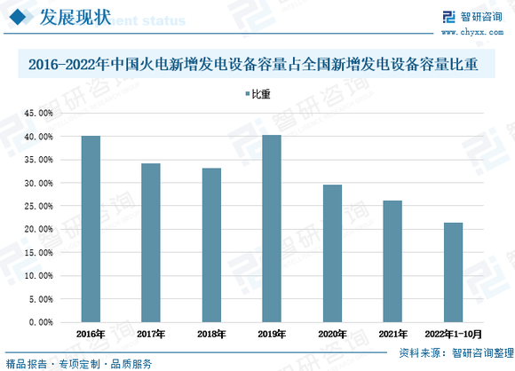 从新增发电设备比重情况来看,2016-2021年期间我国火电新增发电设备容量占全国新增发电设备容量的比重整体呈下滑走势,2021年我国火电新增发电设备容量占全国新增发电设备容量的比重为26.25%,相较2016年下滑了近14个百分点。2022年1-10月全国火电新增发电设备容量占全国新增发电设备容量的比重为21.36%,虽然受电力市场化改革持续推进以及“碳达峰”“碳中和”目标等因素影响,电源结构将逐步向绿色低碳转型,清洁能源电量对火电电量挤占程度加剧,但近年来我国火电新增发电设备容量仍保持着较高比重。