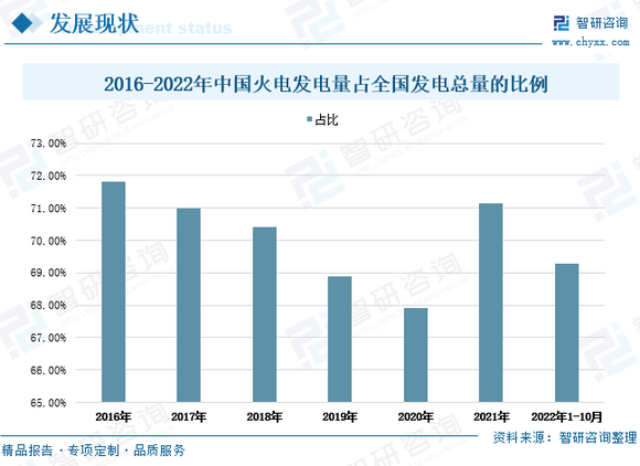 根据官方统计数据显示,2016-2021年期间我国火电发电量占全国发电总量的比例呈上下小幅波动走势,2021年全国火电发电量占全国发电总量的比例为71%,相较2016年比重下滑了近1个百分点。2022年1-10月全国火电发电量占全国发电总量的比例69.3%。可以看出,2016-2022年期间中国火电发电量占据全国发电总量七成左右比例,火力发电仍是中国电力生产的主力电源。
