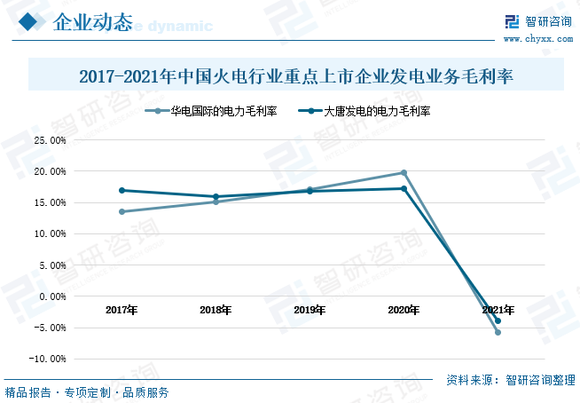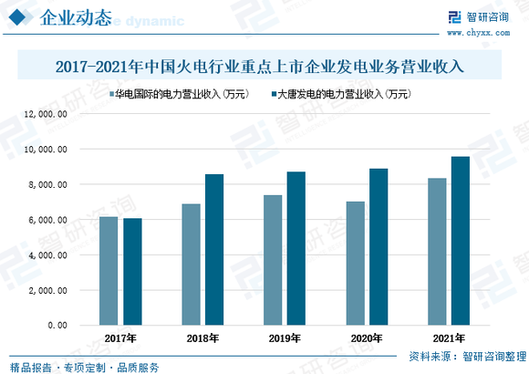 从中国火电行业重点上市企业的发电业务收入情况来,2017-2021年华电国际和大唐发电的发电业务营业收入均整体呈上升趋势。其中2021年华电国际的发电业务营业收入为8364.2万元,同比增长19.2%,相较2017年全年发电业务营业收入增加了2201万元。2021年大唐发电的发电业务营业收入为9551.7万元,同比增长7.5%,相较2017年全年发电业务营业收入增加了3489万元。