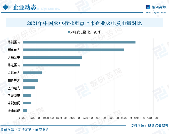 经过多年的发展,一大批优秀的火电企业迅速崛起,逐渐成为火电行业中的重点企业,如华能国际、上海电力、华电国际、金山股份、天富能源、京能电力、申能股份、大连热电、华电能源、华银电力、通宝能源、国电电力、内蒙华电、国投电力、宁波能源、大唐发电等。从中国火电行业重点上市企业火电发电量情况来看,2021年华能国际火电发电量位居全国第一,为4319.95亿千瓦时;国电电力和大唐发电位居全国第二、第三,其火电发电量分别为3895.91亿千瓦时、2264.96亿千瓦时。