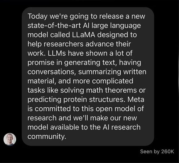 扎克伯格说,LLaMA“在生成文本、进行对话、总结书面材料以及解决数学定理或预测蛋白质结构等更复杂的任务方面表现出了很大的潜力”。