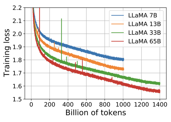 其中,拥有650亿参数的LLaMA和拥有330亿参数的LLaMA使用1.4万亿Tokens进行训练,最小的拥有70亿参数的LLaMA在1万亿Tokens上进行了训练。