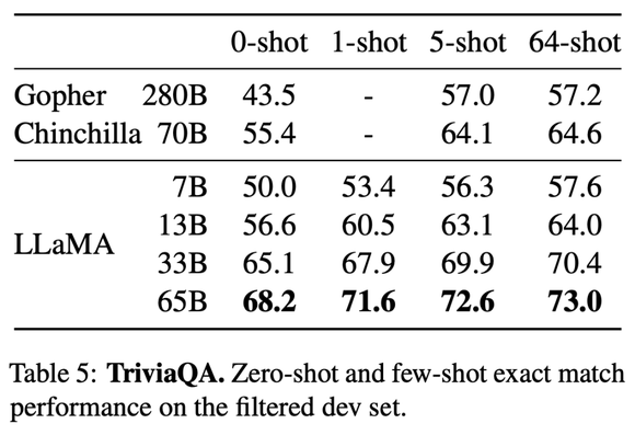 研究人员就闭卷答疑对LLaMA进行了测试,该基准测试的数据集包含阅读理解与问答的大规模语料集TriviaQA以及自然问题。