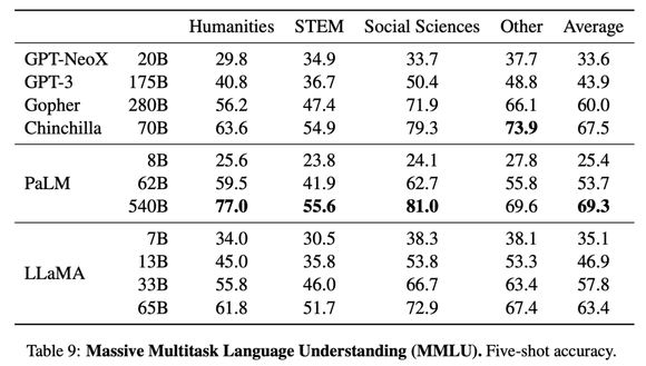 经比较,研究人员发现,拥有650亿参数的LLaMA在大多数领域平均落后于拥有700亿参数的Chinchilla和拥有5400亿参数的PaLM几个百分点。