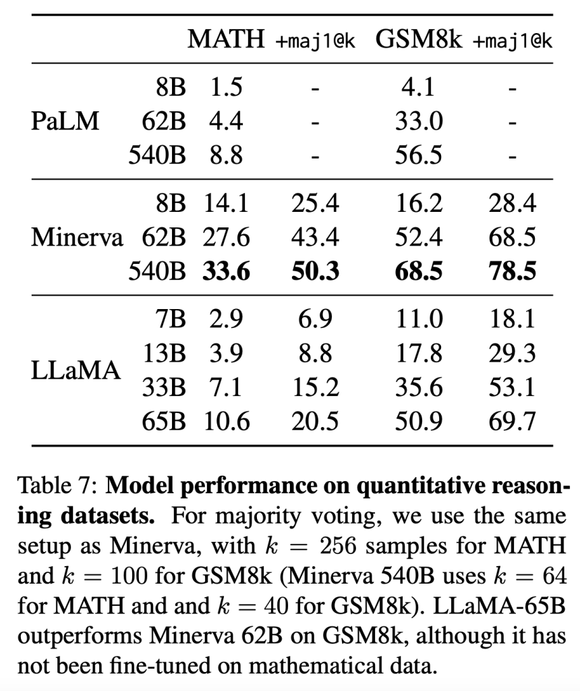 结果显示,在GSM8k上,拥有650亿参数的LLaMA优于拥有620亿参数的Minerva。