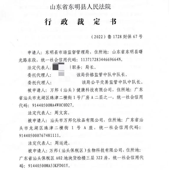 其中提到,申请人东明县市场监督管理局在查处万邦(汕头)健康科技有限公司、汕头市万邦化妆品有限公司、万邦(汕头保税区)生物科技有限公司、骆媛、陈智翔、赵鸣燕、周运进、周昭扬涉嫌传销一案中,为防止被申请人转移隐匿违法资金,于2023年1月28日向山东省东明县人民法院申请冻结上述被申请人在银行、支付宝(中国)网络技术有限公司和财付通支付科技有限公司的资金,冻结金额共计5500万元。