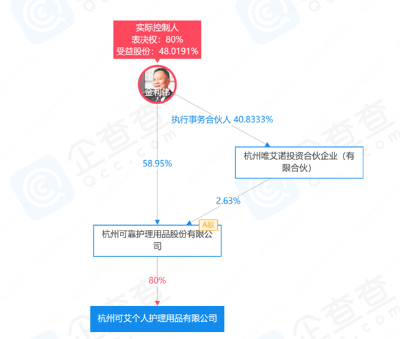 企查查资料显示,万邦科技的供应商为杭州可靠护理用品股份有限公司(以下简称“可靠护理”),而可靠护理掌握着杭州可艾个人护理用品有限公司(下称:“可艾个护”)80%的股权,二者的法人皆为金利伟。